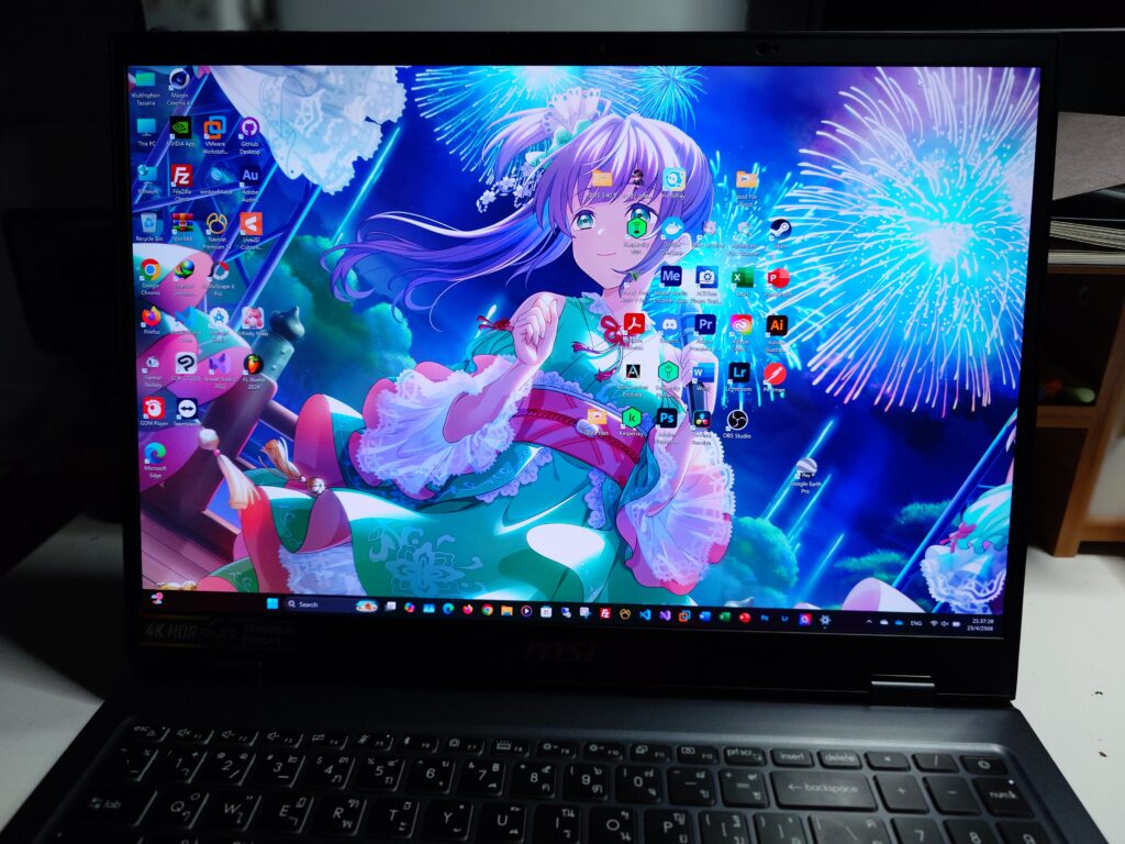 ความรู้สึกแรกตอนที่เห็นคือเครื่องบางจริง ๆ จับแล้วน้ำหนักเบา ซึ่งตอนอยู่ที่งานก็ได้บูธ Banana แนะนำให้เป็นอย่างดี ซึ่งก็ยังไม่ได้เล่นเครื่องอะไรมากที่งาน แต่ก็ให้ Upgrade SSD จาก 1TB เป็น 4TB โดยมีช่างของ MSI ไปประจำที่งาน และแน่นอนว่าค่าเปลี่ยนนั้นฟรี พอกลับบ้านมือจึงมาลง Windows ใหม่ + Program ต่าง ๆ ที่จะใช้